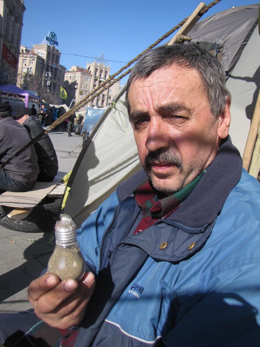 Він каже, що відчув щось гаряче на руці. Я повів його до лікарів. До речі в Жовтневому після Беркуту залишилися купи використаних шприців. Чим їх там кололи, я не знаю. Але ж очевидно – вони не думали, що ми люди.