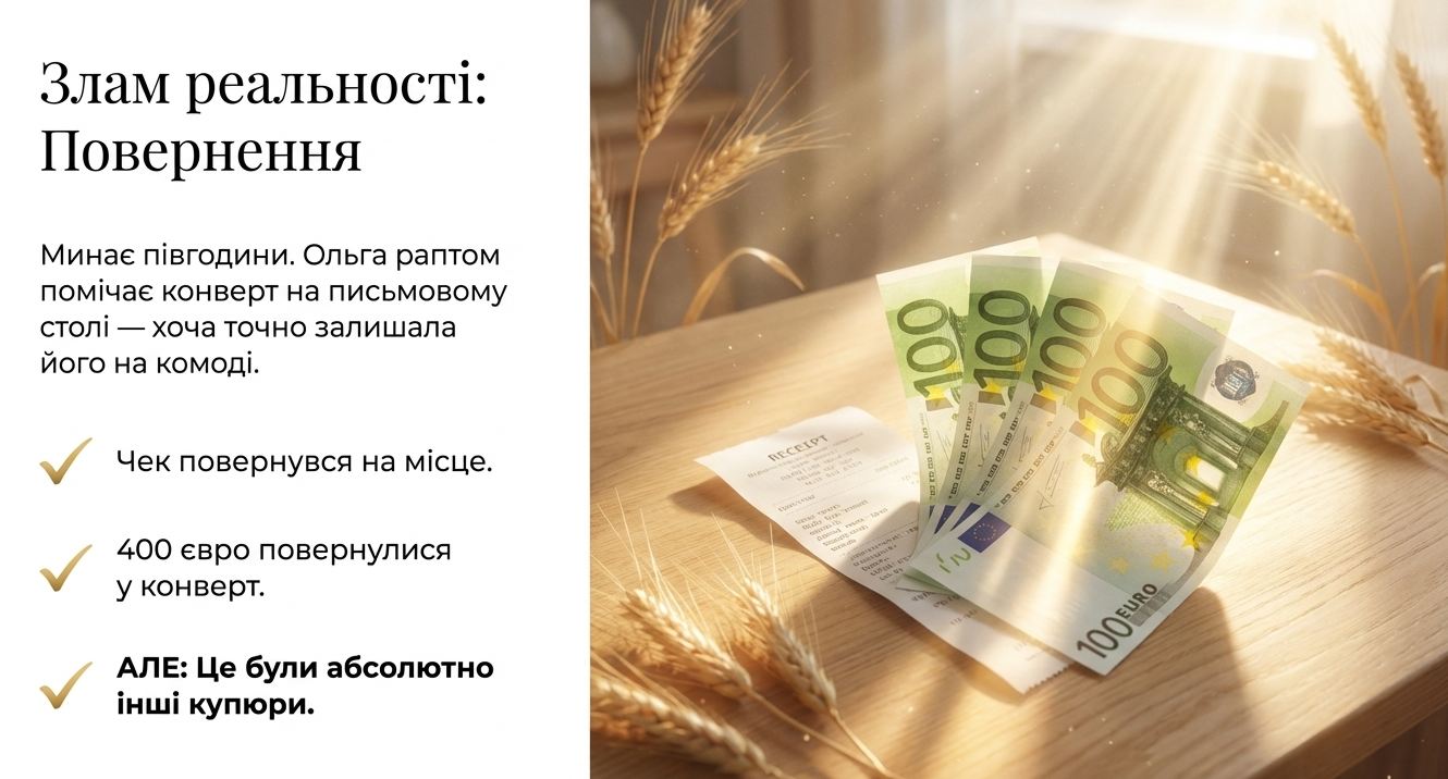 Поки ці думки крутилися в її голові, поки дивування, сум’яття й розпач переповнювали Ольгу Петрівну, пройшло не більше ніж півгодини. Аж раптом вона побачила на письмовому столі той самий конверт, а в ньому – чек і 400 євро. Але 400 євро були не в 50-ти єврових купюрах, які їй видали в обмінному пункті, а в новісіньких 100-єврових, а конверт був на письмовому столі, а не на комоді, куди вона його поклала разом з сумкою та усім вмістом сумки, коли шукала зниклі 400 євро і чек.