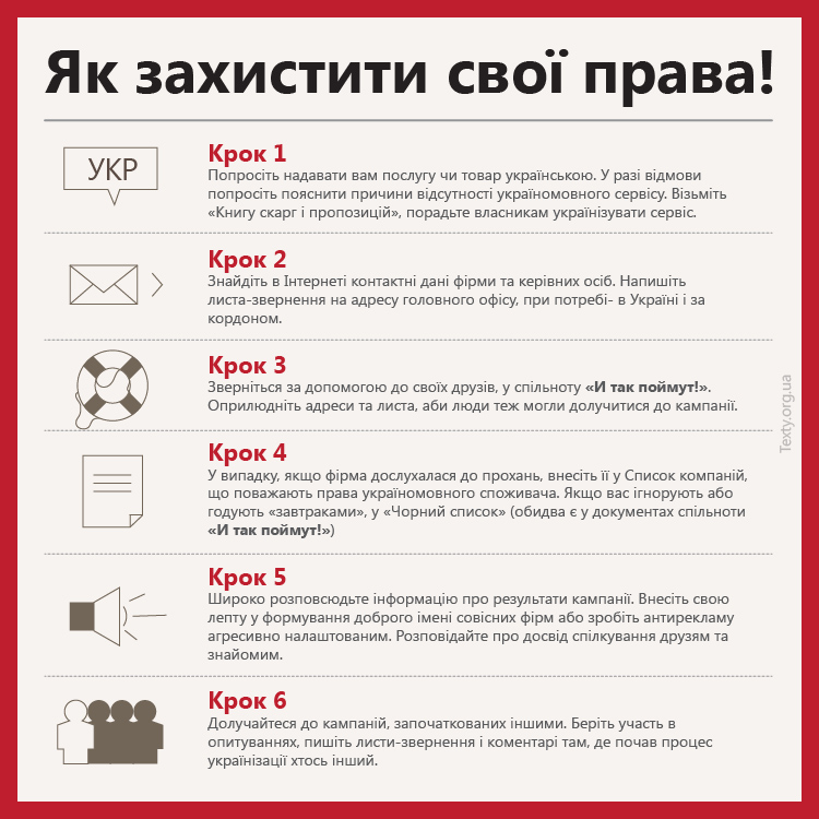 У спільноти «И так поймут!» понад три тисячі учасників. Активісти певні: правом україномовного споживача отримувати інформацію про товари і послуги рідною мовою безсовісно нехтують. І так далі тривати не може. Вони вимагають від комерційних фірм спілкування українською і досягають успіху.